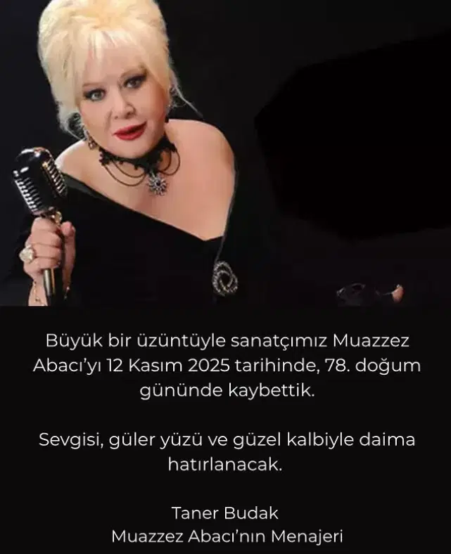 Usta sanatçı Muazzez Abacı 78’inci doğum günü olan 12 Kasım’da hayata gözlerini yumdu. Menajeri Taner Budak acı haberi sosyal medyadan duyurdu.