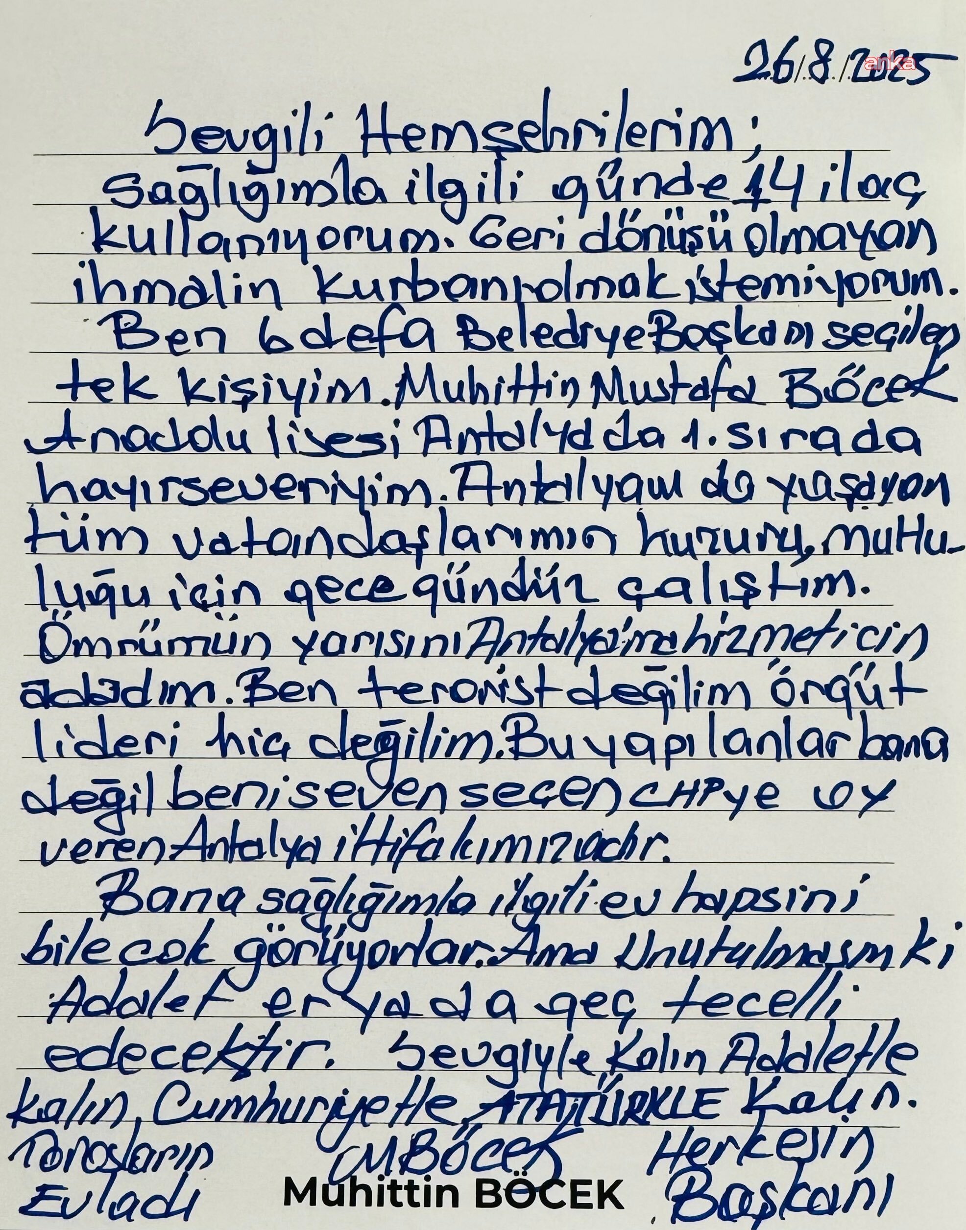 Yaklaşık 25 yıllık siyasi hayatında altı kez belediye başkanlığına seçildiğini hatırlatan Böcek, “Hayatımın yarısını Antalya’ya hizmete adadım. Benim adım Muhittin Böcek; terörle, suçla yan yana getirilmeye çalışılmak büyük haksızlıktır” dedi.