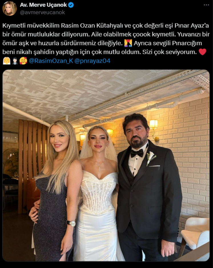 “Kıymetli müvekkilim Rasim Ozan Kütahyalı ve çok değerli eşi Pınar Ayaz’a bir ömür mutluluklar diliyorum. Aile olabilmek çoook kıymetli. Yuvanızı bir ömür aşk ve huzurla sürdürmeniz dileğiyle. Ayrıca sevgili Pınarcığım beni nikah şahidin yaptığın için çok mutlu oldum. Sizi çok seviyorum”