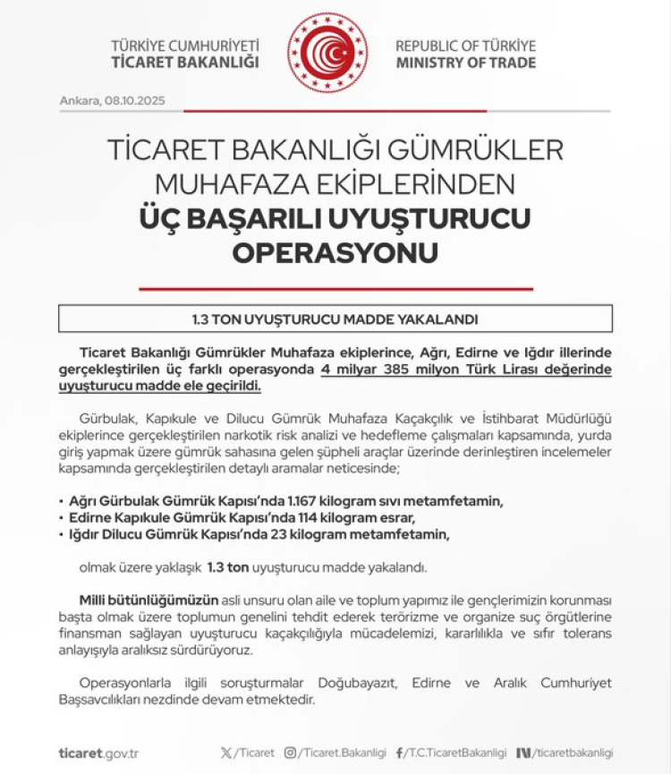 “Milli bütünlüğümüzün asli unsuru olan aile, toplum yapımız ve gençlerimizi korumak için uyuşturucu kaçakçılığıyla mücadelemizi sıfır tolerans anlayışıyla sürdürüyoruz” diyen Ticaret Bakanlığı, uyuşturucunun terörizme ve organize suç örgütlerine finansman sağladığını vurguladı. Bakanlık, gümrüklerdeki denetimlerin ve kaçakçılıkla mücadelenin kararlılıkla devam edeceğini kaydetti.