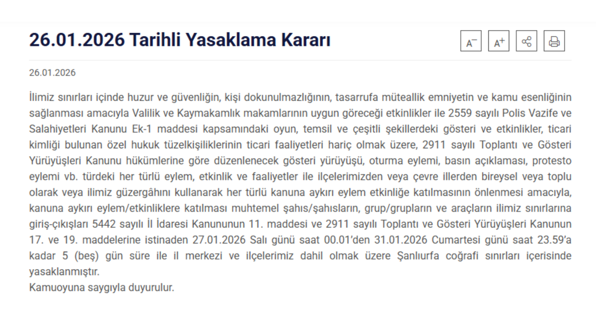 Valiliğin açıklamasında, “İlimiz sınırları içinde huzur ve güvenliğin, kişi dokunulmazlığının, tasarrufa müteallik emniyetin ve kamu esenliğinin sağlanması amacıyla Valilik ve Kaymakamlık makamlarının uygun göreceği etkinlikler ile 2559 sayılı Polis Vazife ve Salahiyetleri Kanunu Ek-1 maddesi kapsamındaki oyun, temsil ve çeşitli şekillerdeki gösteri ve etkinlikler, ticari kimliği bulunan özel hukuk tüzelkişiliklerinin ticari faaliyetleri hariç olmak üzere, 2911 sayılı Toplantı ve Gösteri Yürüyüşleri Kanunu hükümlerine göre düzenlenecek gösteri yürüyüşü, oturma eylemi, basın açıklaması, protesto eylemi vb. türdeki her türlü eylem, etkinlik ve faaliyetler ile ilçelerimizden veya çevre illerden bireysel veya toplu olarak veya ilimiz güzergâhını kullanarak her türlü kanuna aykırı eylem etkinliğe katılmasının önlenmesi amacıyla, kanuna aykırı eylem/etkinliklere katılması muhtemel şahıs/şahısların, grup/grupların ve araçların ilimiz sınırlarına giriş-çıkışları 5442 sayılı İl İdaresi Kanununun 11. maddesi ve 2911 sayılı Toplantı ve Gösteri Yürüyüşleri Kanunun 17. ve 19. maddelerine istinaden 27.01.2026 Salı günü saat 00.01’den 31.01.2026 Cumartesi günü saat 23.59’a kadar 5 (beş) gün süre ile il merkezi ve ilçelerimiz dahil olmak üzere Şanlıurfa coğrafi sınırları içerisinde yasaklanmıştır.” ifadelerine yer verildi.
